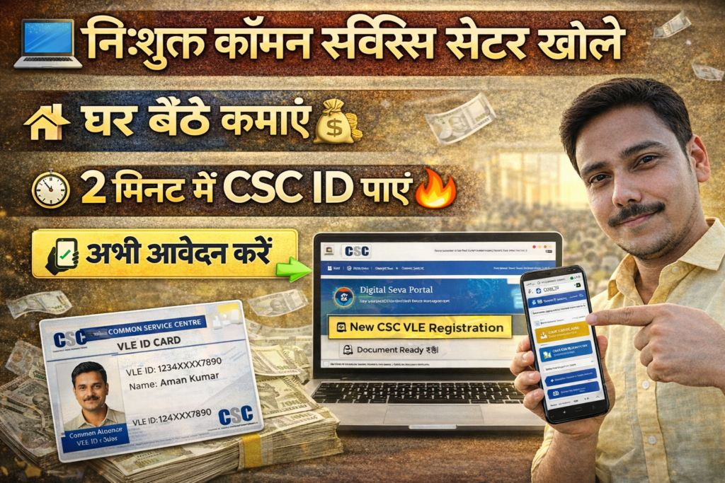рдХреЙрдорди рд╕рд░реНрд╡рд┐рд╕ рд╕реЗрдВрдЯрд░ (CSC) рднрд╛рд░рдд рд╕рд░рдХрд╛рд░ рдХреА рдПрдХ рдбрд┐рдЬрд┐рдЯрд▓ рд╕реЗрд╡рд╛ рд╣реИ, рдЬрд┐рд╕рдХреЗ рдорд╛рдзреНрдпрдо рд╕реЗ рдЖрдк CSC рд╕реЗрдВрдЯрд░ рдЦреЛрд▓рдХрд░ рд╕рд░рдХрд╛рд░реА рдПрд╡рдВ рдирд┐рдЬреА рд╕реЗрд╡рд╛рдПрдВ рдкреНрд░рджрд╛рди рдХрд░ рд╕рдХрддреЗ рд╣реИрдВред CSC ID рдХреЗ рд▓рд┐рдП рдЖрд╡реЗрджрди рдСрдирд▓рд╛рдЗрди рдХрд┐рдпрд╛ рдЬрд╛рддрд╛ рд╣реИ рдФрд░ рдЗрд╕рдХреЗ рд▓рд┐рдП VLE (Village Level Entrepreneur) рдХреЗ рд░реВрдк рдореЗрдВ рдкрдВрдЬреАрдХрд░рдг рдХрд░рдирд╛ рд╣реЛрддрд╛ рд╣реИред