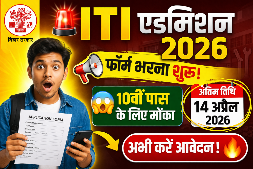 Bihar ITI Admission 2026 नमस्कार दोस्तों यदि आप चाहते हैं बिहार से सरकारी कॉलेज से आईटीआई करना तो आप सभी के लिए बड़ी खुशखबरी है क्योंकि औद्योगिक प्रशिक्षण संस्थान प्रतियोगिता प्रवेश परीक्षा 2026 के लिए ऑनलाइन आवेदन प्रक्रिया 16 मार्च 2026 से शुरू होने जा रहा है आवेदन करने की अंतिम तिथि 14 अप्रैल 2026 तक रखा गया है इस लेख में हम आपको पूरी जानकारी बताने जा रहे हैं आप इस लेख को ध्यानपूर्वक पढ़े पसंद आए तो आपसे निवेदन है कि इस लेख को अपने दोस्तों के साथ भी शेयर करें और कोई सवाल है तो कमेंट बॉक्स में जरूर लिखे