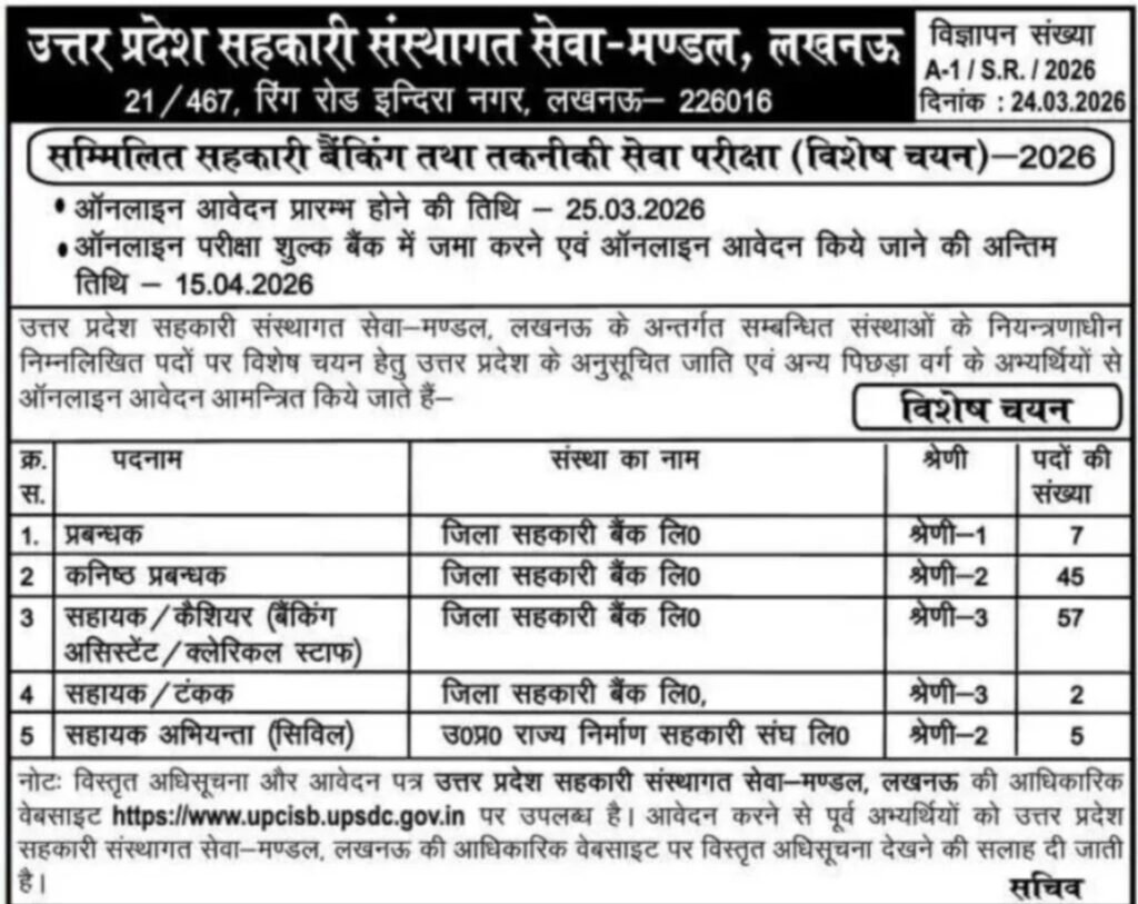 UP Cooperative Bank Vacancy 2026: क्या आप उत्तर प्रदेश सहकारी बैंक में नौकरी प्राप्त करना चाहते हैं, तो आपके लिए एक बहुत बड़ी खुशखबरी निकल कर आ रही हैं क्योंकि उत्तर प्रदेश सहकारी संस्थागत सेवा बोर्ड (UPCISB) ने मैनेजर, जूनियर असिस्टेंट मैनेजर जैसे विभिन्न 116 पदों पर भर्ती के लिए आधिकारिक अधिसूचना जारी कर दी गई हैं जिसमें कि उम्मीदवार 25 मार्च 2026 से लेकर 15 अप्रैल 2026 तक ऑनलाइन आवेदन कर पाएंगे।